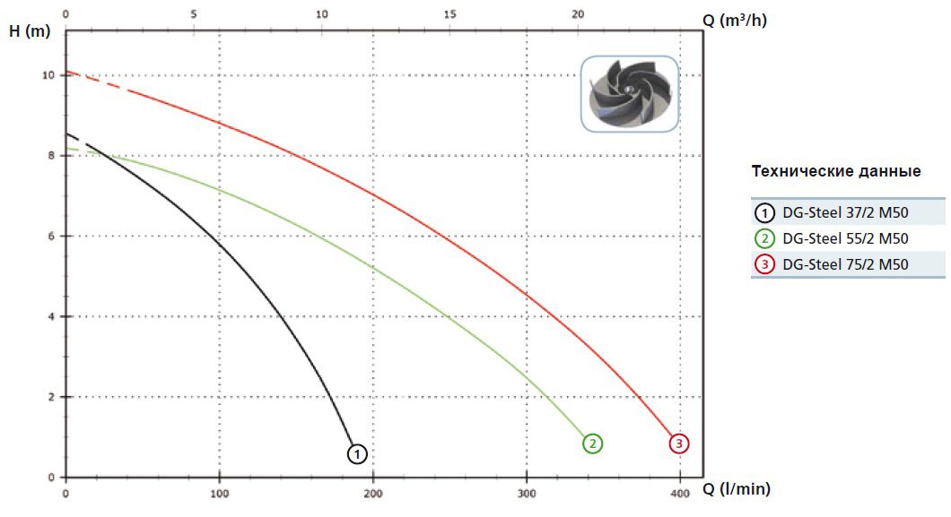 Насосные агрегаты типа DG-Steel - погружные с открытым рабочим колесом и вертикальным подающим патрубком. Проточная часть насоса, рабочие колеса выполнены из нержавеющей стали; имеют водяное охлаждение двигателя.