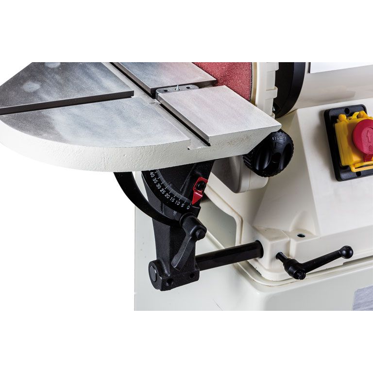 Тарельчато-шлифовальный узел состоит из алюминиевого диска с креплением абразивных листов на «липучке» и чугунного рабочего стола. В его поверхности предусмотрено два перпендикулярных Т-образных паза для работы с угловым упором или устройством для шлифования по кругу. Стол имеет механизм точной регулировки по углу наклона с транспортирной шкалой.