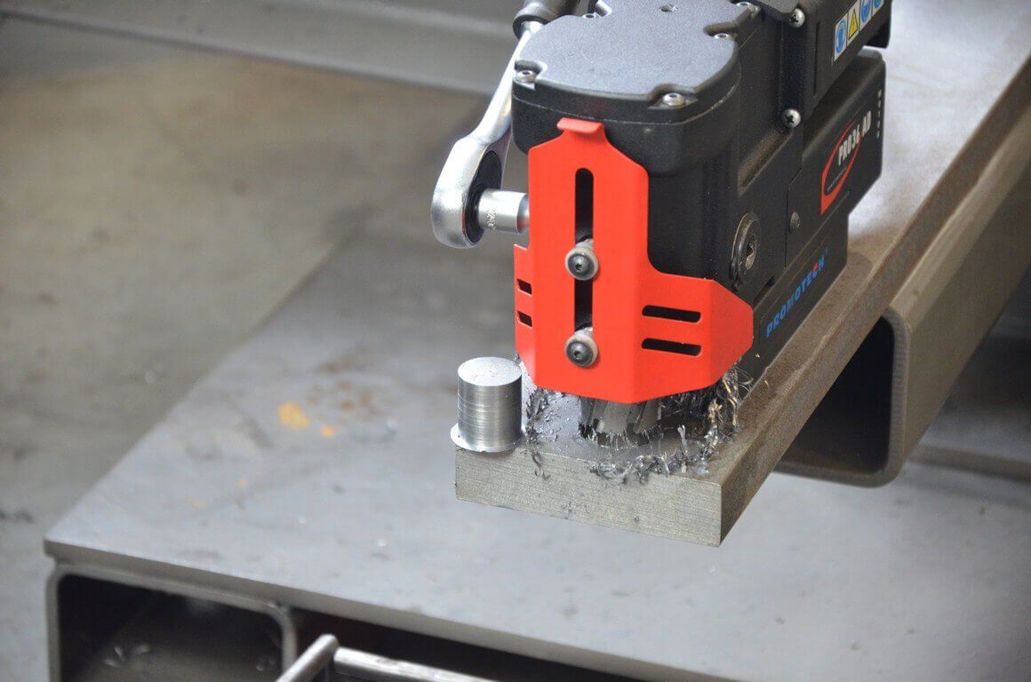 Данный магнитный сверлильный станок объединяет в себе всю плюсы своих аналогов. Еще более компактная электрическая сверлильная машина, имеет высоту всего лишь 176 мм и длину равную 380 мм. Помещается даже в самых узких местах, успешно прошел все испытания, соответствует все стандартам качества промышленного инструмента. Благодаря легкому весу (не превышает 9.5 кг), сверхкомпактной контракции магнитной сверлильной машины дает возможность выполнять работы по сверлению, рассверливанию и зенкерованию металла, в местах с ограниченным пространством, где из-за своих габаритов не помещаются обычные магнитные сверлильные станки, что уже говорить про стационарные станки. Легкий вес магнитного станка, дает возможность, быстро переставлять станок от отверстия к отверстию.