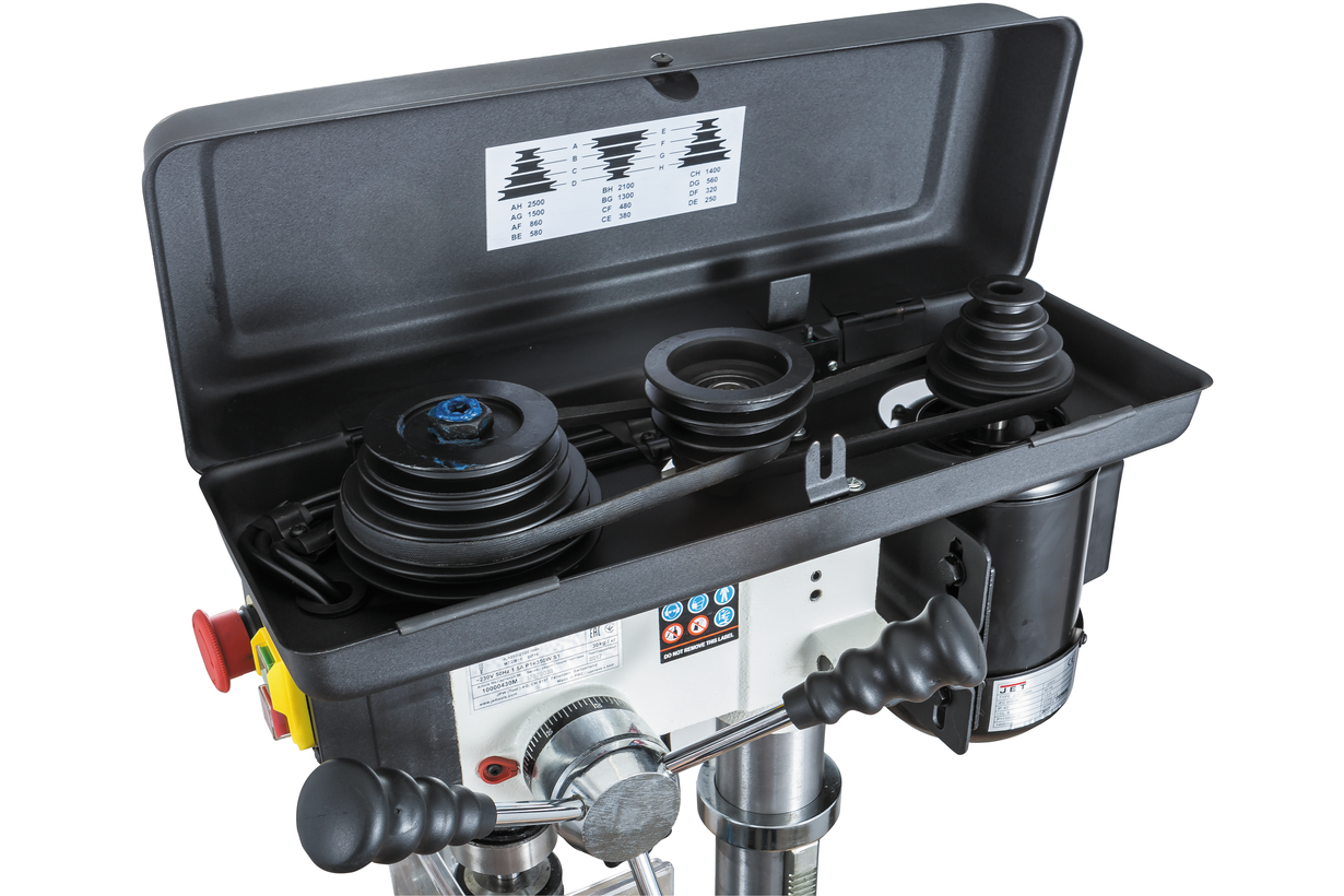 Рукоятка привода пиноли оборудована лимбом для контроля подачи и имеет встроенный ограничитель хода (глубины сверления). В штатный комплект поставки входят станочные тиски Wilton, для крепления которых предусмотрены пазы на столе и на опорном основании станка.