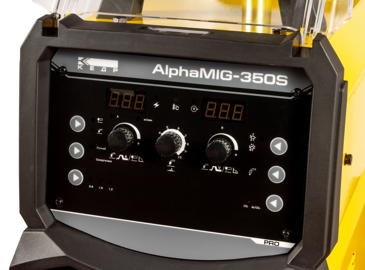 КЕДР AlphaMIG-350S - это промышленный полуавтомат для производительной и высококачественной сварки, работающий в паре с компактным и мощным 4-роликовым подающим устройством.