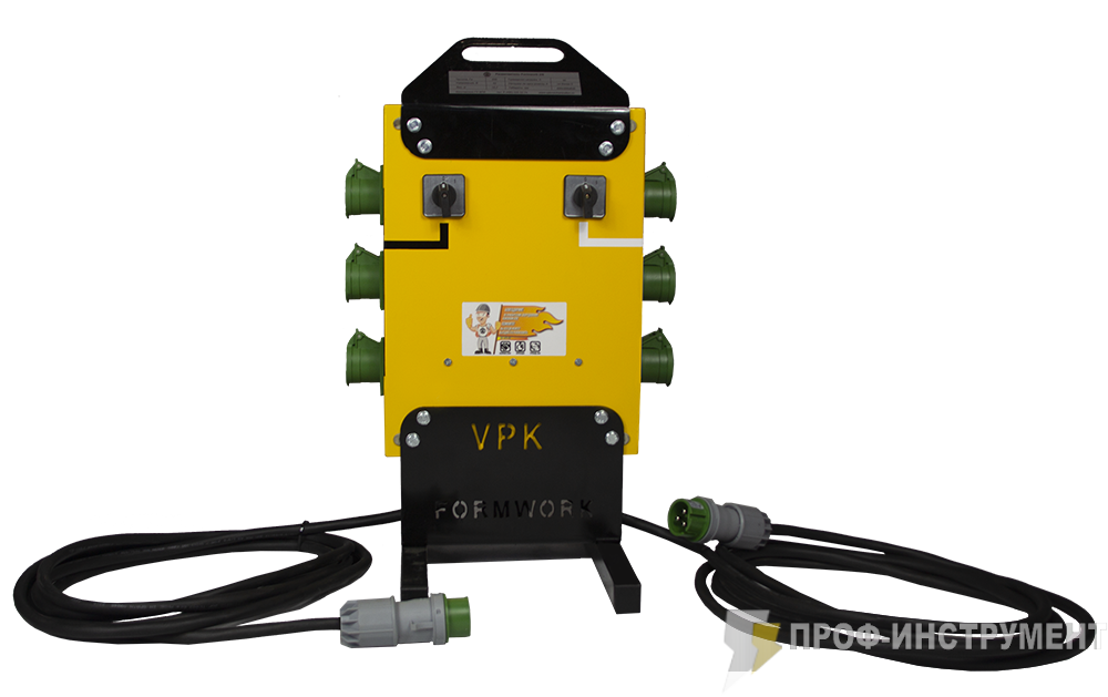 Разветвитель VPK Formwork 2/6 предназначен для подключения до 6-ти внешних вибраторов. Представляет собой коммутационное устройство с возможностью работы как от 1-ого преобразователя частоты, так и одновременно от 2-х независимых преобразователей. Для этого на входе имеются два кабеля с вилками 42В и 200 Гц. Минимальный ток каждой линии должен составлять 20 А. Каждый из двух кабелей питает группу розеток (3 шт) через группу переключателей (3 шт) для подключения шести внешних вибраторов.