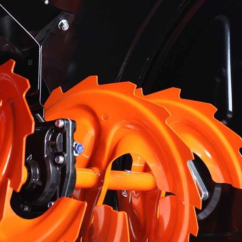 В конструкции снегоуборщика используются только подшипники, а не втулки. Шестерня редуктора шнека выполнена из бронзы, что в десятки раз увеличивает ресурс снегоуборщика. На заводе производится регулировка и обкатка каждой единицы техники в собранном состоянии. Укомплектован стальными планками увеличивающими ширину захвата для свежевыпавшего снега. Фара позволяет продолжать работу после наступления темноты.