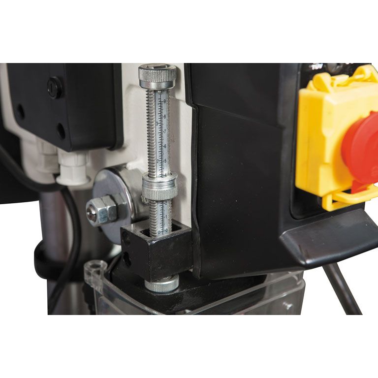 Станок укомплектован чугунным столом, регулируемым по углу установки и по высоте; реечный механизм с вращающейся рукояткой облегчает перемещение по вертикали. Сверлильная часть выполнена литой из чугуна. Для контроля глубины сверления предусмотрена шкала с миллиметровой и дюймовой разметкой, а также регулируемый ограничитель. Стандартная комплектация включает в себя удобный быстрозажимной патрон и станочные тиски для фиксации заготовок.