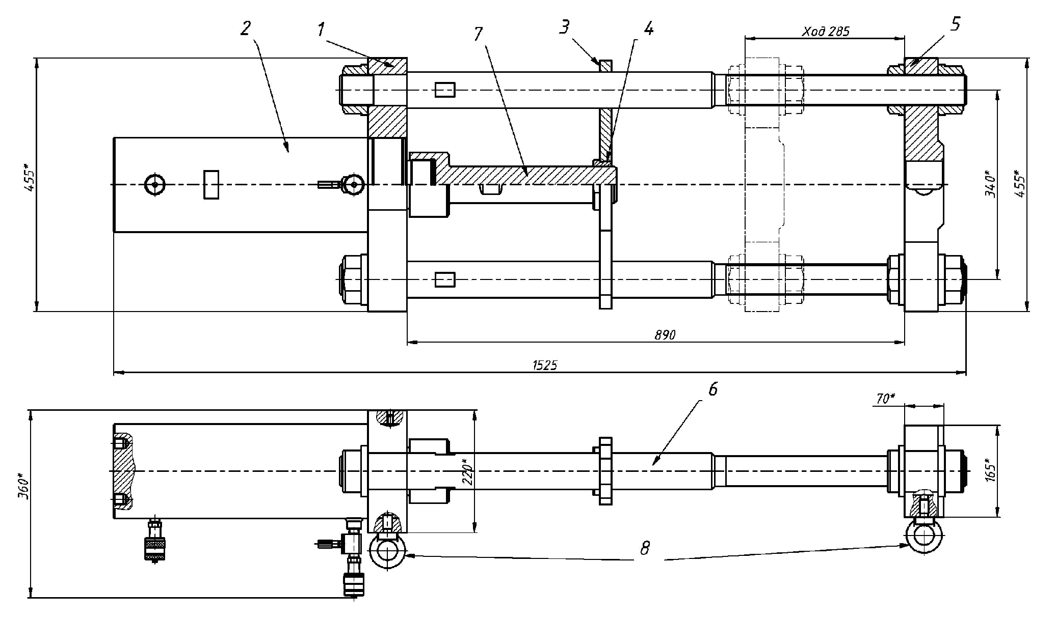 Основными составными частями выпрессовщика являются: траверса (1) с домкратом (2), плита направляющая (3), в которой установлена направляющая втулка (4); плита опорная (5); две шпильки (6). На шток домкрата (1) установлен палец (7) Для установки выпрессовщика на рабочем месте предусмотрены рым-болты (8).